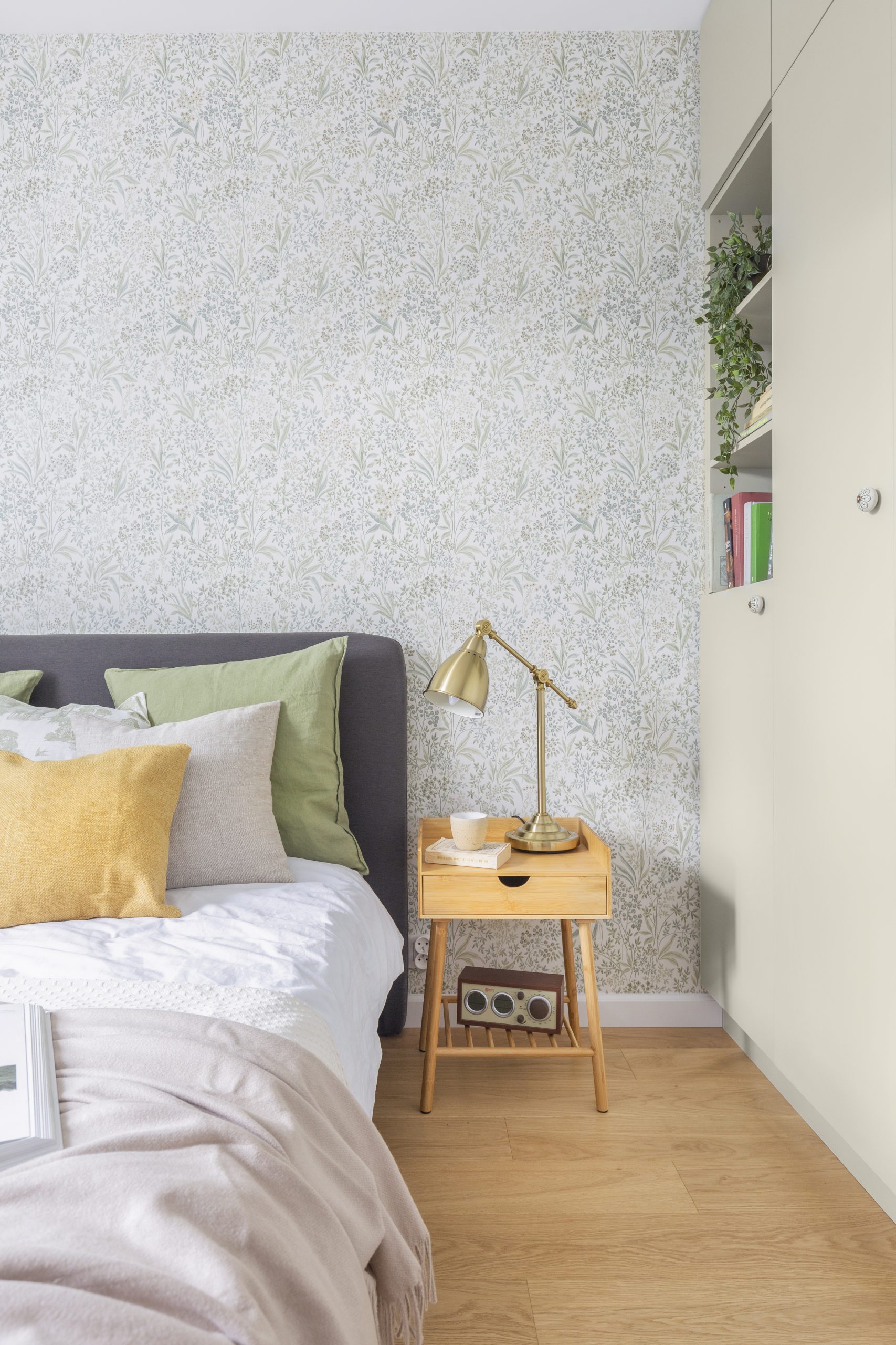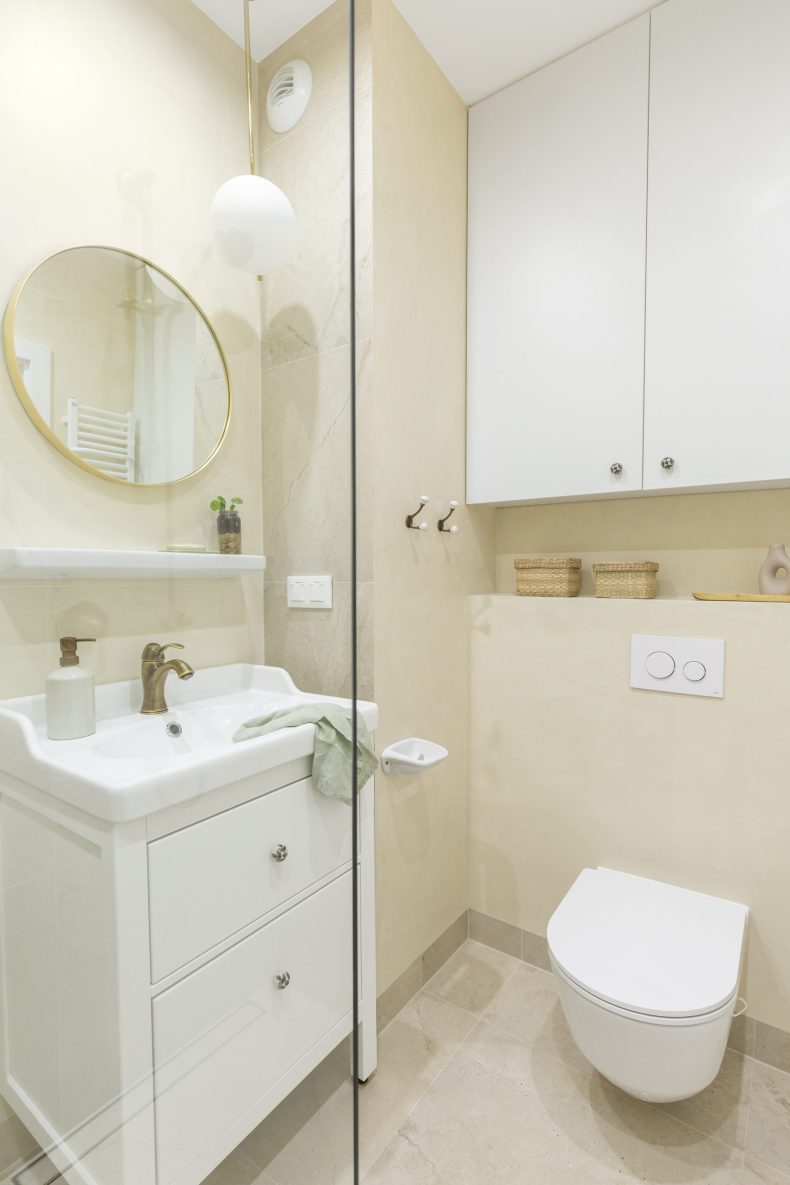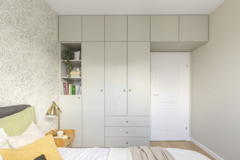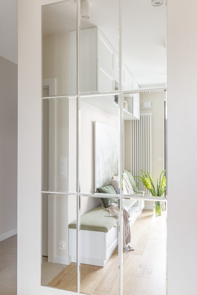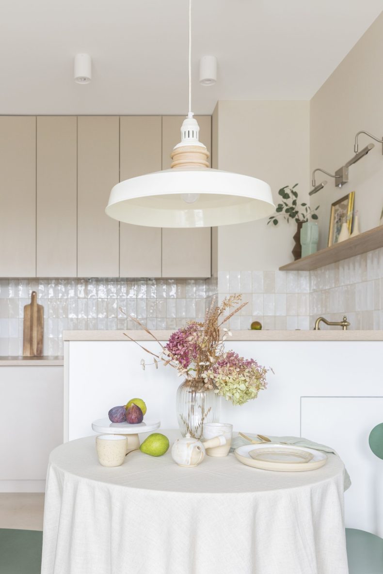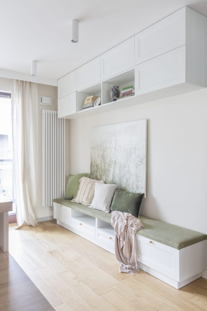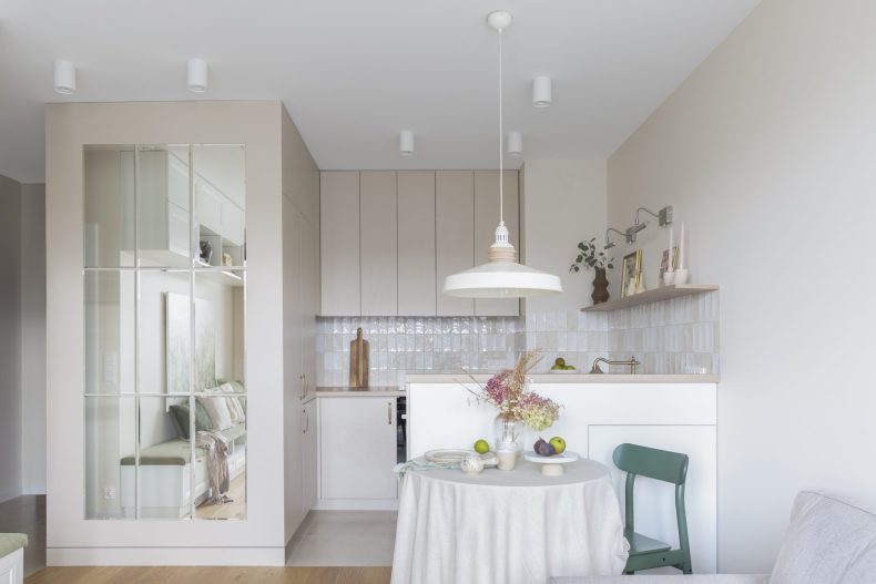 Wnętrze mieszkania wyróżnia się prostotą form i dbałością o detale, które nadają mu wyjątkowy charakter. Dominują tu neutralne kolory, takie jak biel i szarość, przełamane ciepłymi akcentami drewnianych wykończeń.
