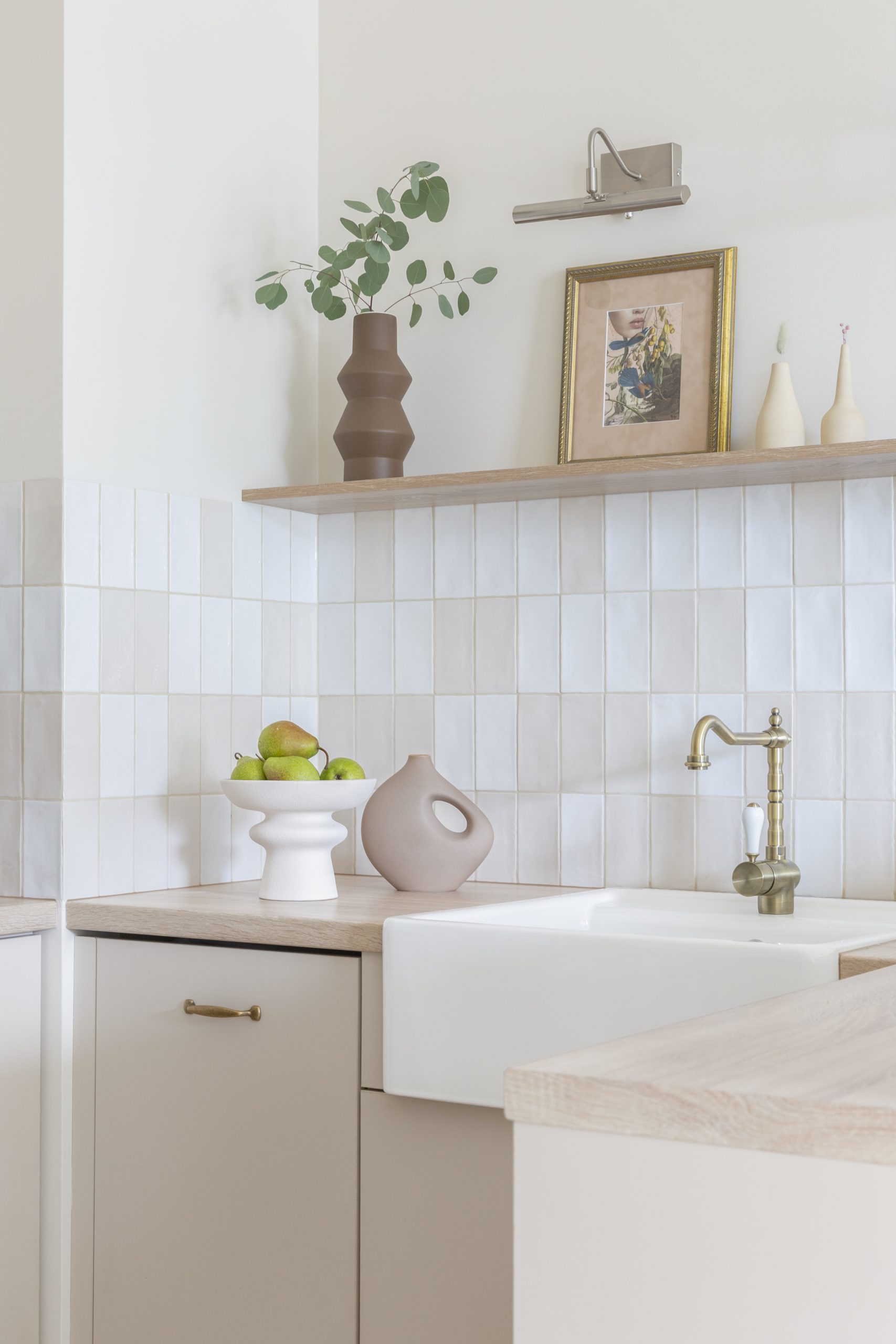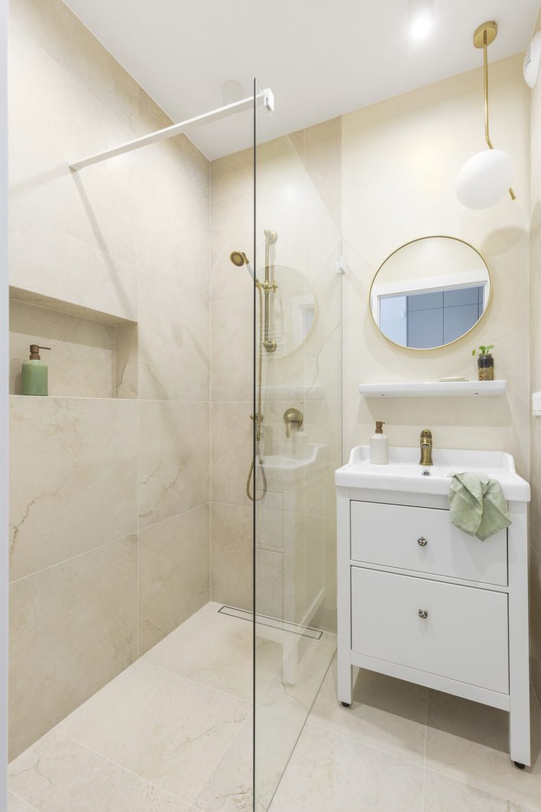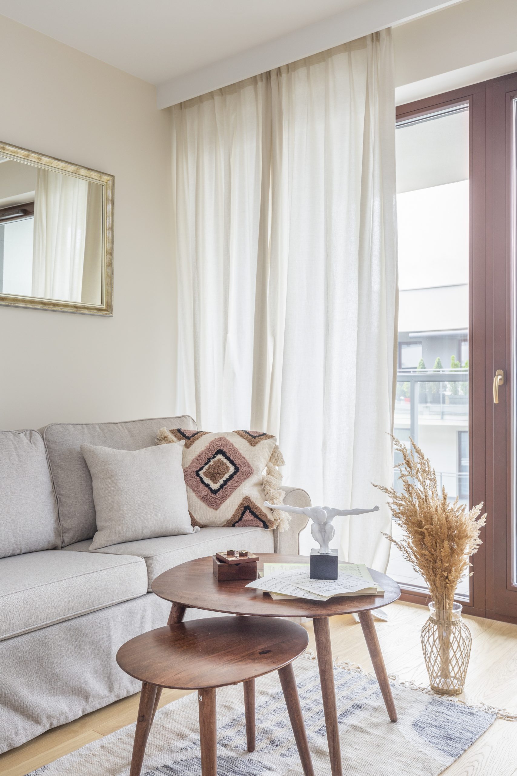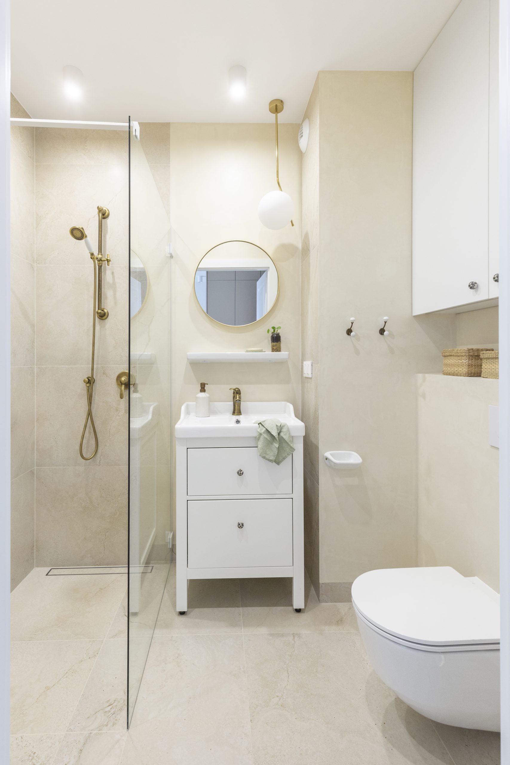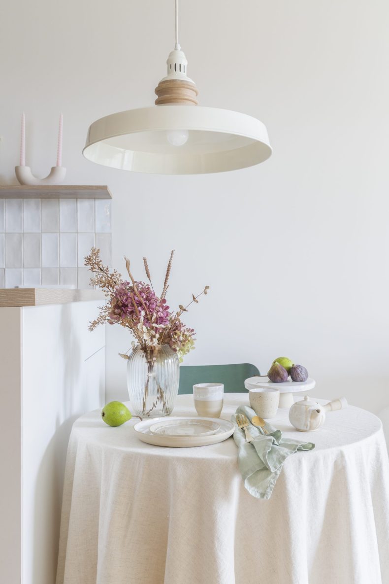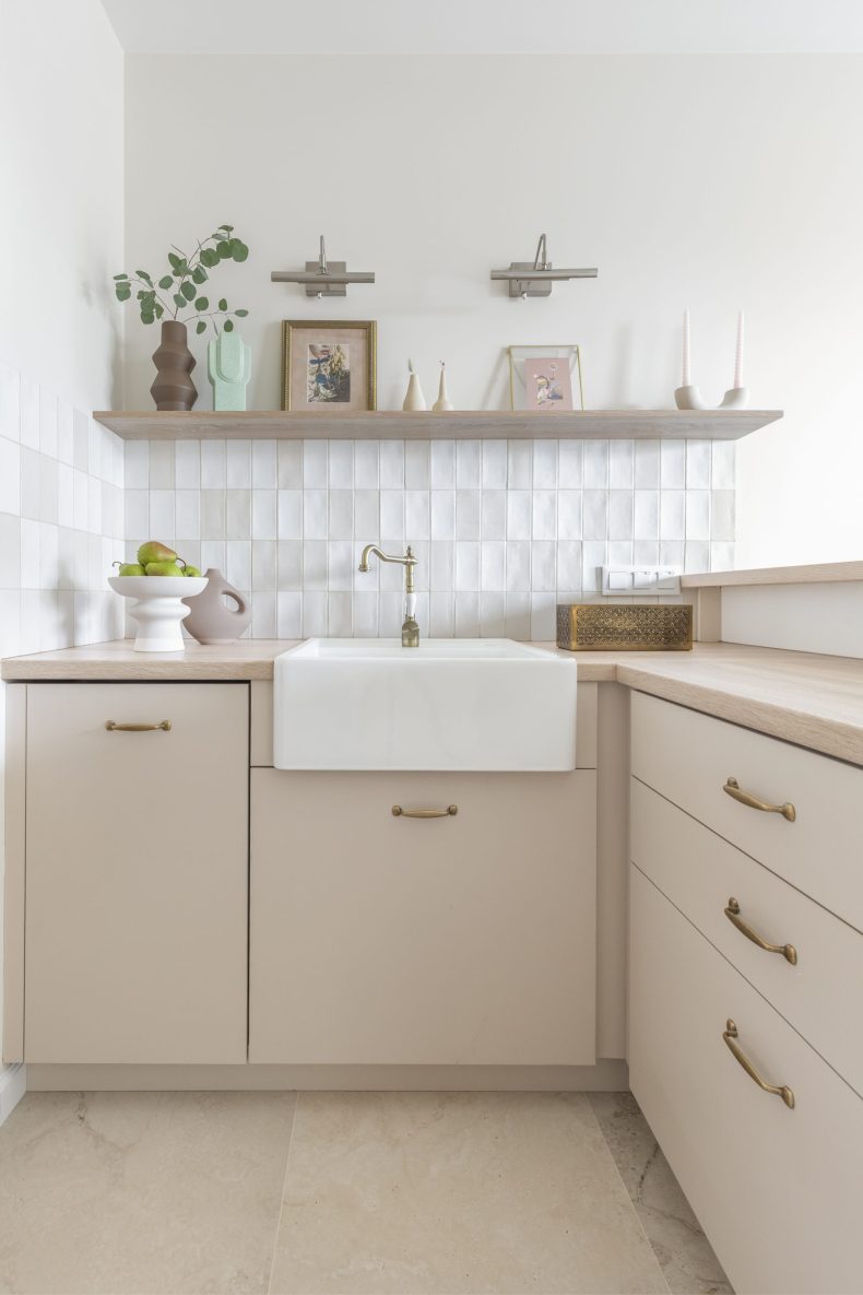 Wnętrze mieszkania wyróżnia się prostotą form i dbałością o detale, które nadają mu wyjątkowy charakter. Dominują tu neutralne kolory, takie jak biel i szarość, przełamane ciepłymi akcentami drewnianych wykończeń.